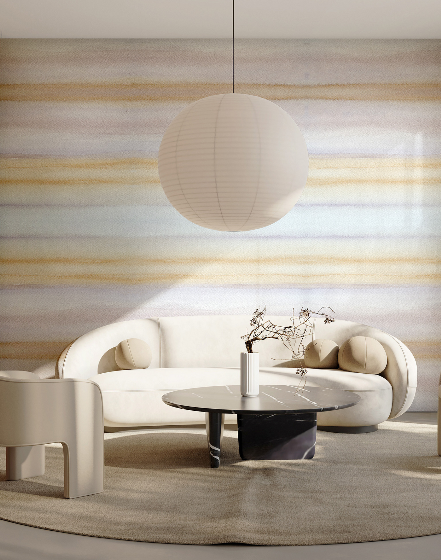 Horizon is a soothing, large scale wallpaper that has the feel of a mural. The original watercolor on which it was based was made using sea water, and it embodies the tranquility and happy moments I experienced spending Summers at the Massachusetts shoreline. Horizon works beautifully with a range of soft colors and textures, and plays well in a bedroom, a nursery, or anywhere you’d like to create a peaceful meditative environment.