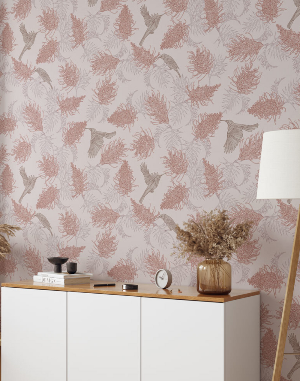 Grevillea flowers are referred to as the original “bush lollies”. This design snapshots the honeyeaters in motion as they drink nectar from the intricate Grevillea flowers. Grevillea Nectar design from Patricia Braune’s Australian Lines Collection.
