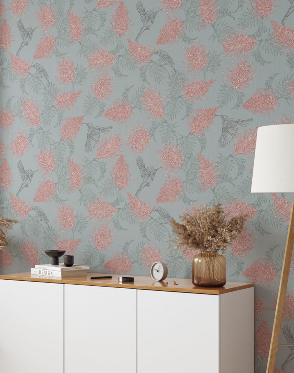 Grevillea flowers are referred to as the original “bush lollies”. This design snapshots the honeyeaters in motion as they drink nectar from the intricate Grevillea flowers. Grevillea Nectar design from Patricia Braune’s Australian Lines Collection.