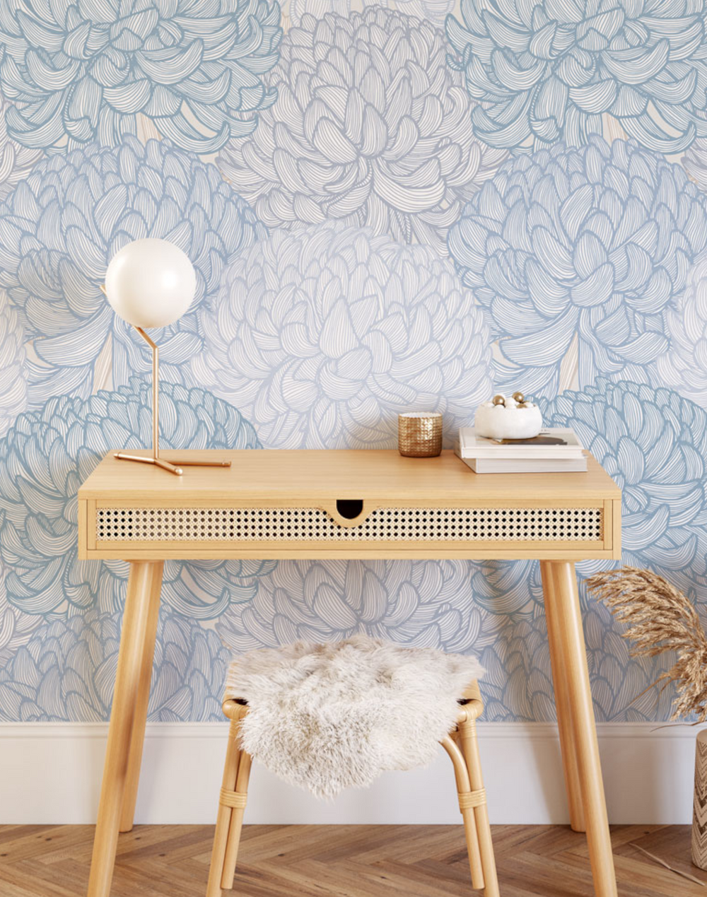 As a Wallpaper and Textile designer, I draw inspiration from the beauty around me and I could not go past the magnificence of the Japanese Kiku Chrysanthemum. My Kiku design incorporates multiple flower illustrations depicting the many-layered petals. Kiku design from Patricia Braune’s Tranquil Lines Collection.