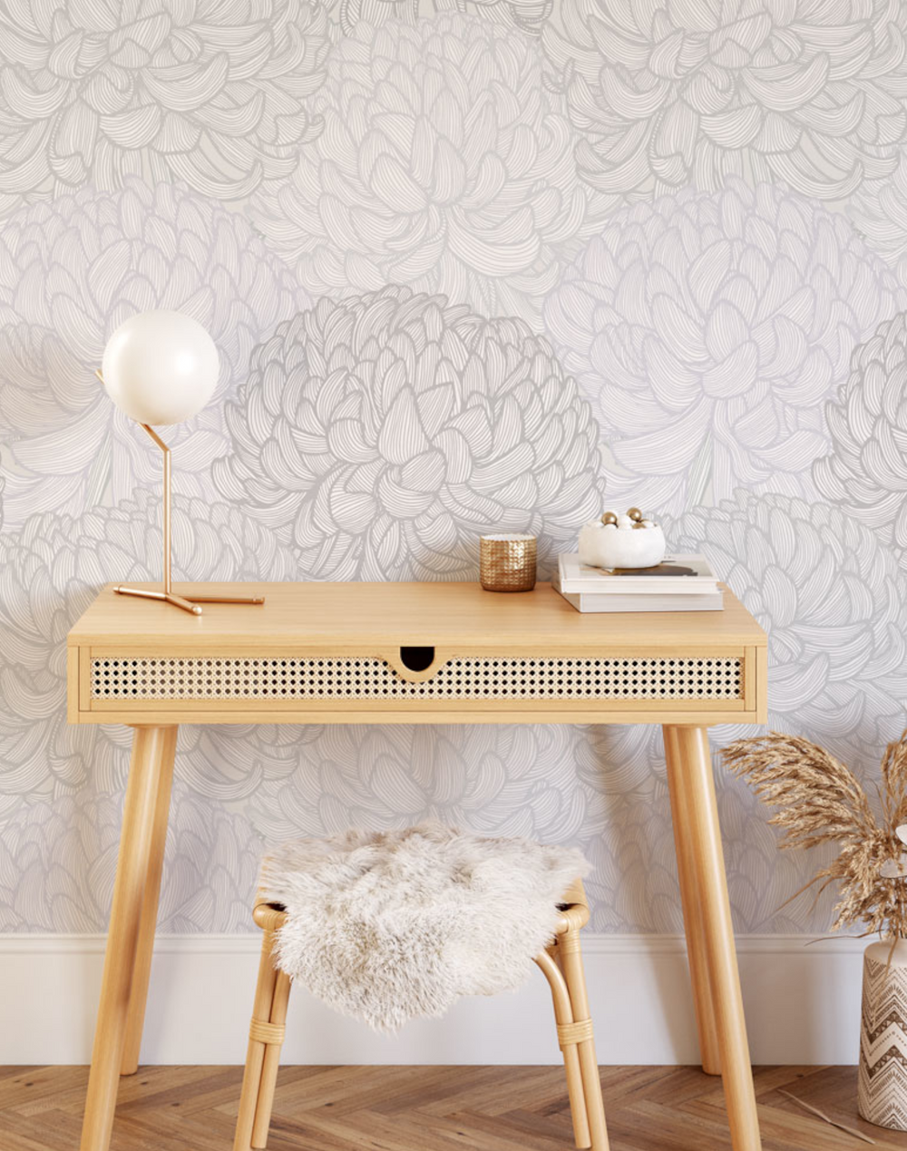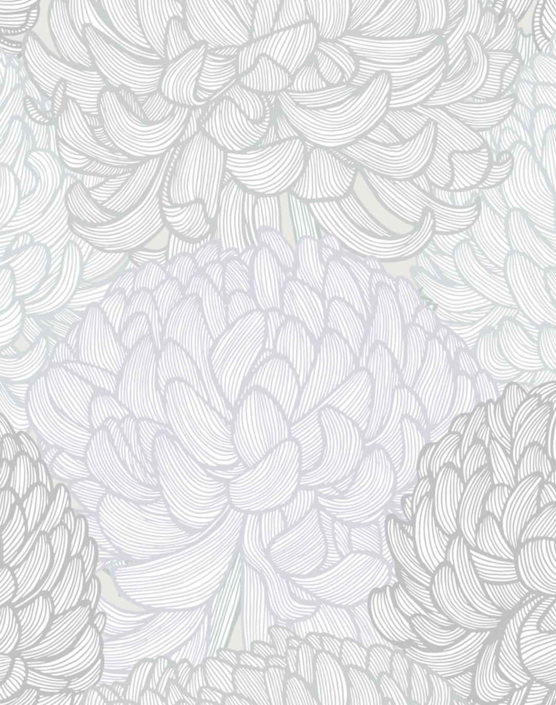 As a Wallpaper and Textile designer, I draw inspiration from the beauty around me and I could not go past the magnificence of the Japanese Kiku Chrysanthemum. My Kiku design incorporates multiple flower illustrations depicting the many-layered petals. Kiku design from Patricia Braune’s Tranquil Lines Collection.