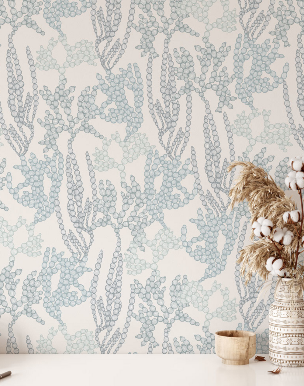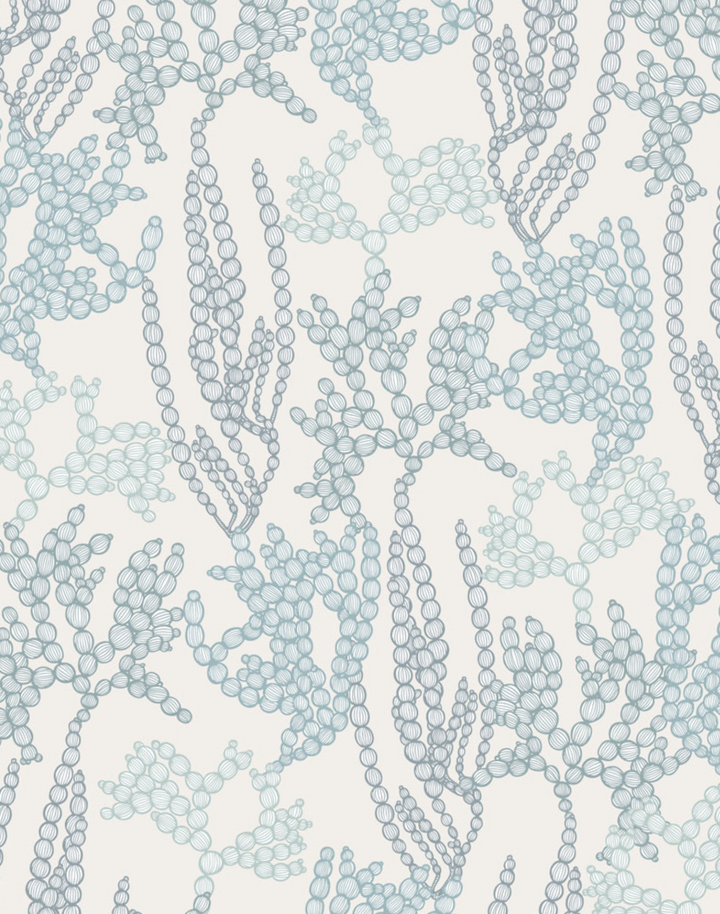 Inspired by Neptune’s necklace or sea grapes, these Australian native algae have such a beautiful definite shape with their spherical beads along tapering strings moving gently with the flow of the wave as it washes up on the shore. Sea Beads design from Patricia Braune’s Coastal Lines Collection.