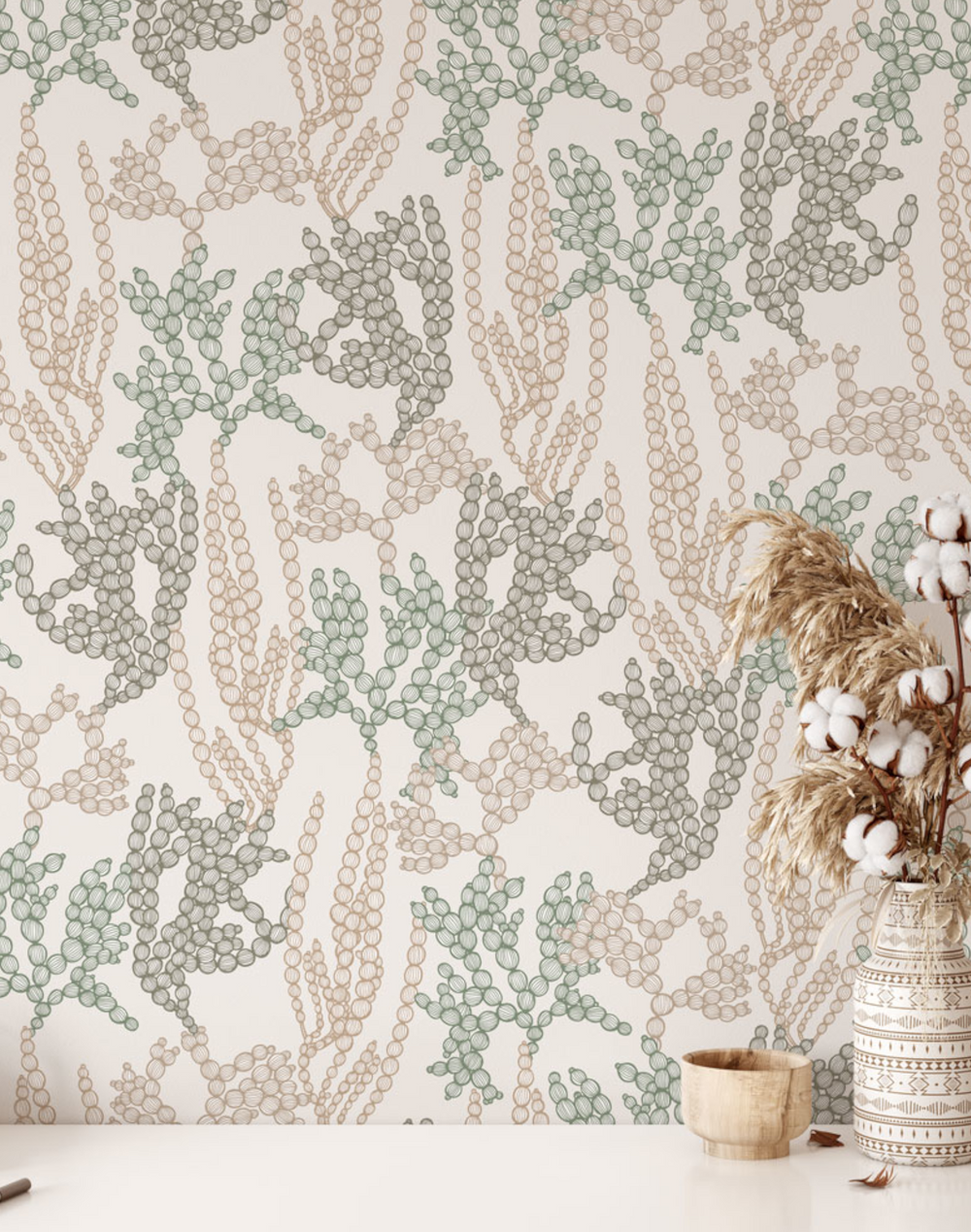 Inspired by Neptune’s necklace or sea grapes, these Australian native algae have such a beautiful definite shape with their spherical beads along tapering strings moving gently with the flow of the wave as it washes up on the shore. Sea Beads design from Patricia Braune’s Coastal Lines Collection.