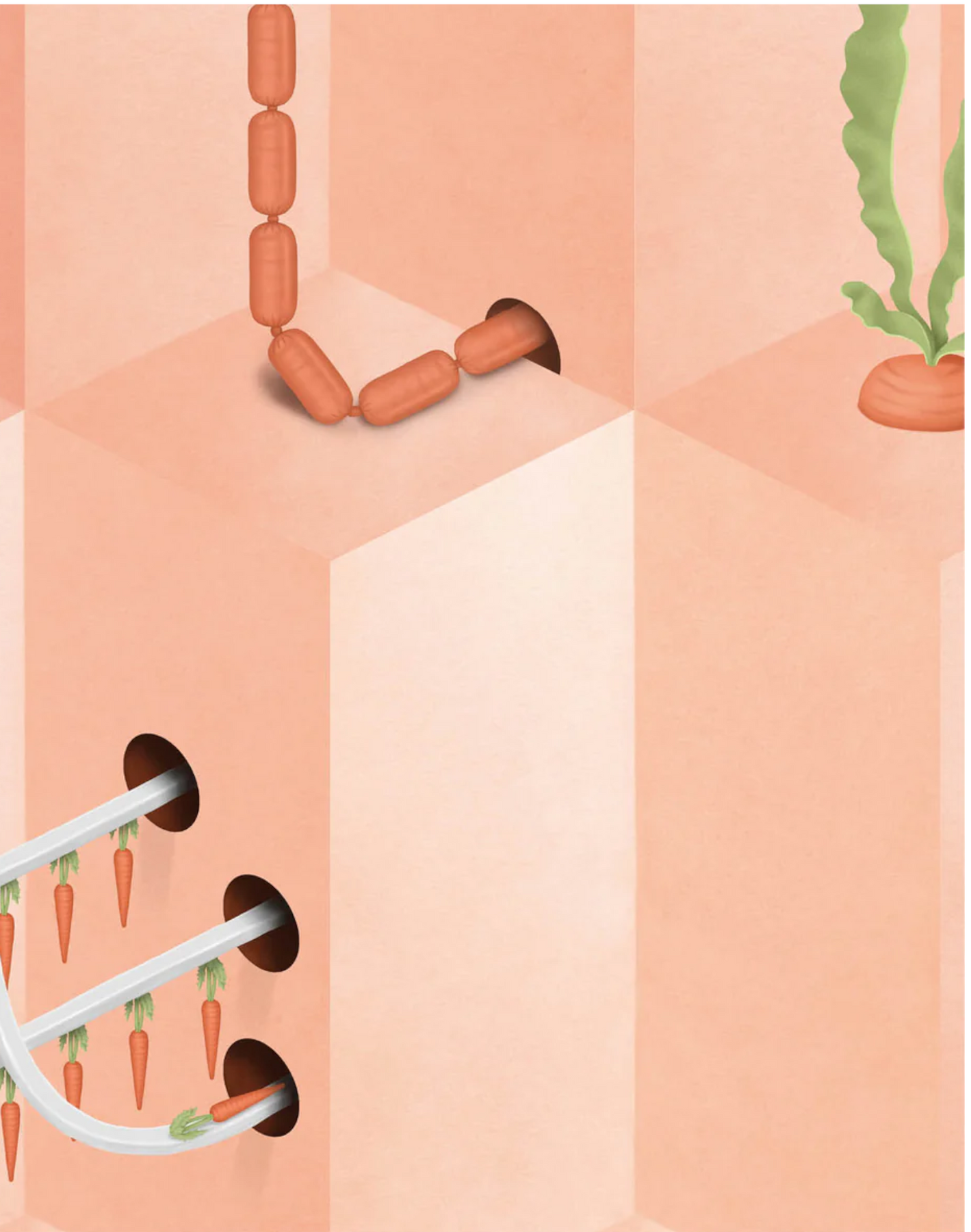 Are you ready to get lost in a maze of colorful fruits, flying vegetables, and towers of Dutch cheese? In this fun pattern, Suzan Hijink shows imagination through the aisles of a grocery store.