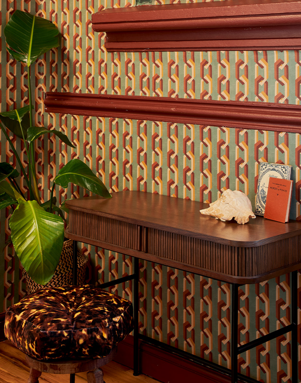A luxurious and simple geometric, ideal for adding contrast, color and depth to any room. The Chain of Fools design features textured interlocking hexagons against a smooth block of color. This all-over repeat is a great option to use in hallways and narrow spaces.