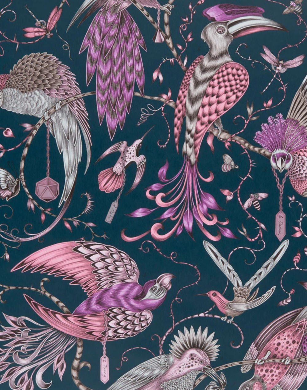The Audubon Wallpaper is part of our magical Animalia collaboration with interior experts Clarke & Clarke. This design is inspired by the work of botanical illustrator John James Audubon, who was known for his incredible paintings depicting magical creatures of the sky. Create a spectacularly showy space with this striking color way; soft pinks contrast with a rich navy background to create a beautiful balance of vibrancy and subtly. The Audubon wallpaper features shimmering metallic highlights throughout the design.