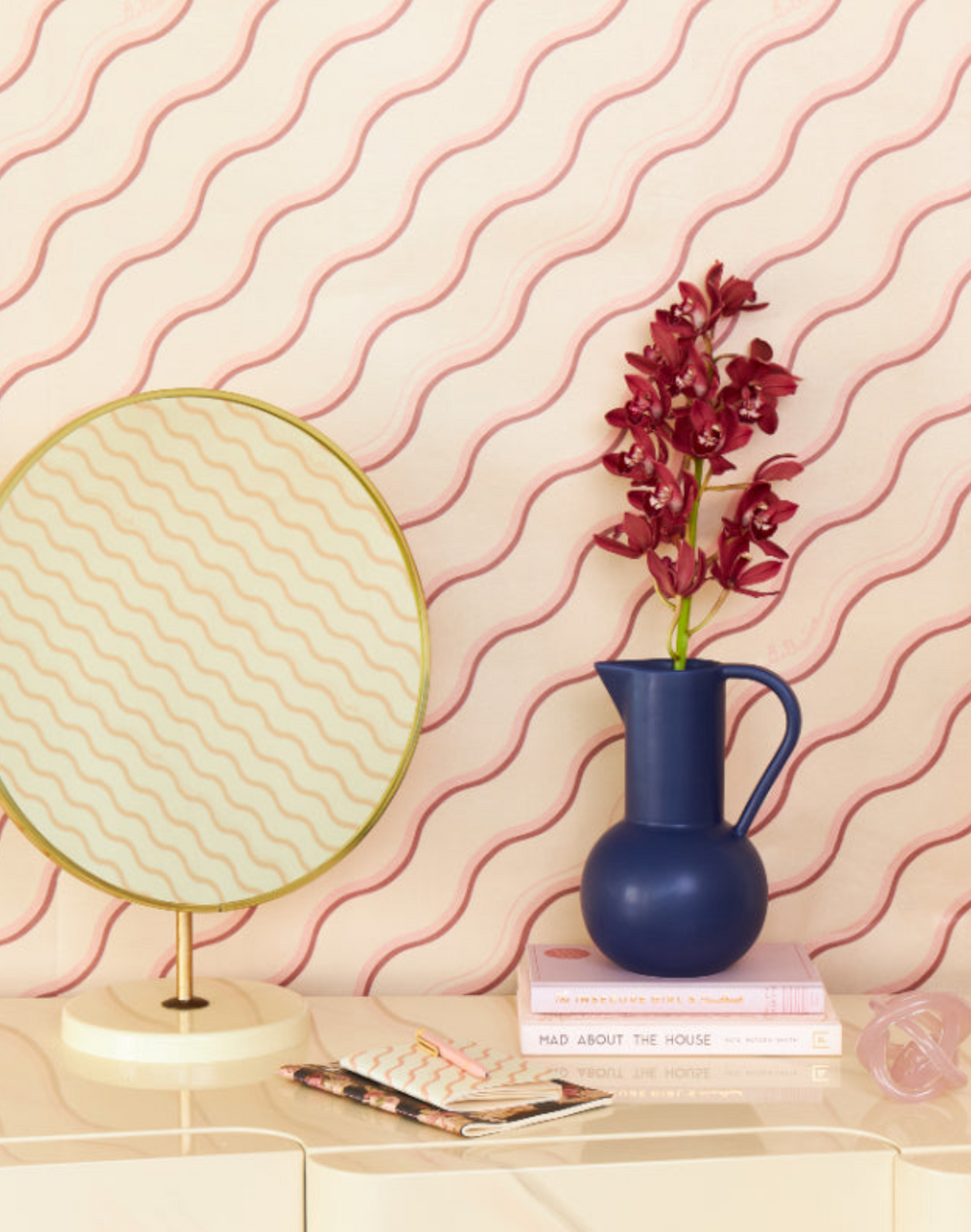 Inspiration for this design first came from Murano's milky glass Mushroom lamp. Our pearlized Belissima wallpaper reimagines the curves and shadows of the lamp through this versatile and effortlessly luxurious yet fun design. The word 'Bellisima' has been hand-written by Whinnies dad and incorporated into the final art, thanks Stu!