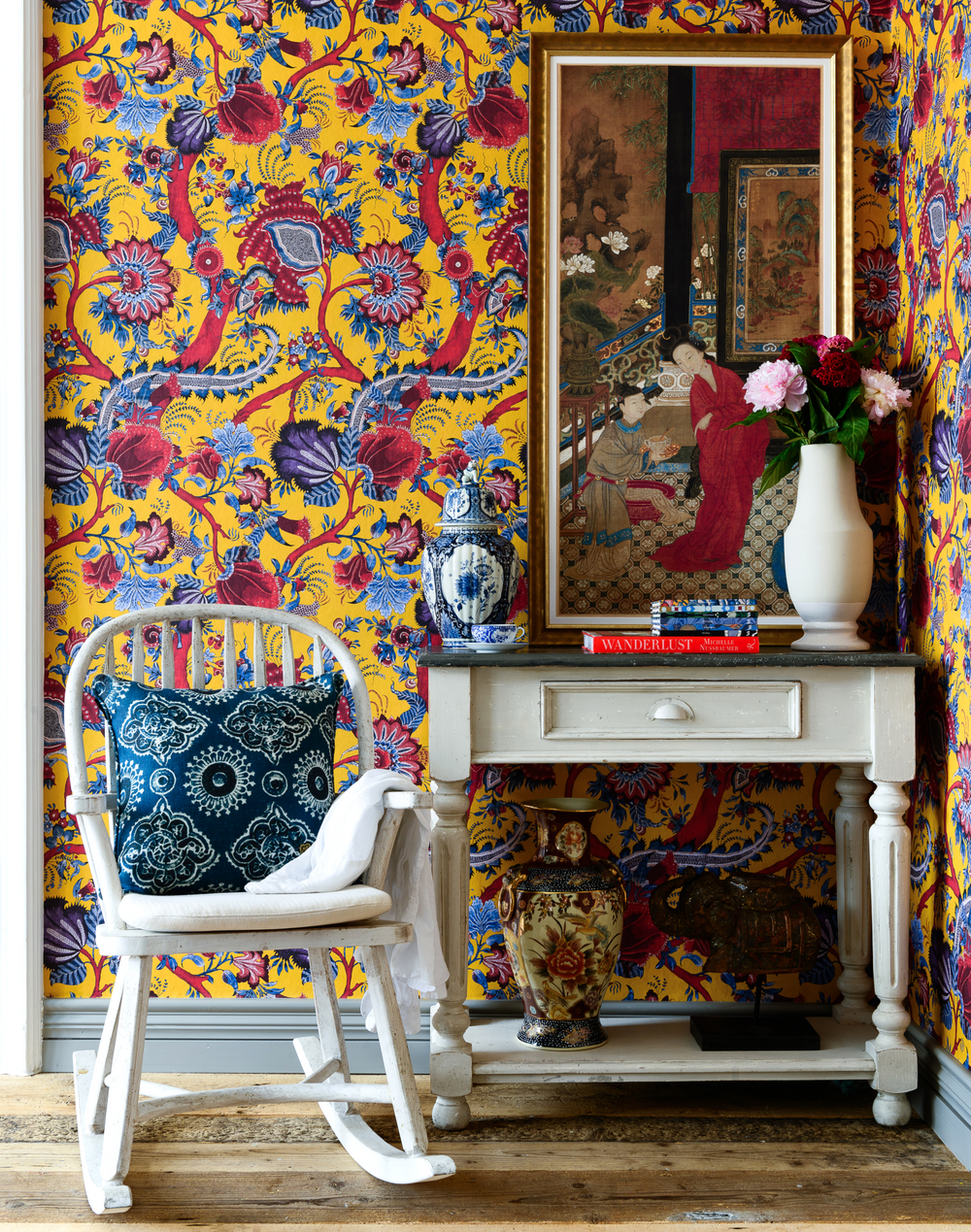 Unveiling a complex and mesmerizing pattern full of beautiful flowers and ornamental plants, painted in bright, bold colors. Tangled in a graceful dance of feather-shaped figures, this oriental style design brings elegance and majestic vibes to any interior. Inspired by the Chinese floral scenery, this aristocratic design has been created in strong red, purple and blue hues to remind of the Oriental culture.