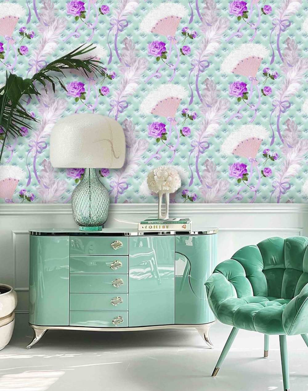 Soft pastel colors and dreamy florals dance across a backdrop of upholstered fabric, while feather fans add an elegant touch to this colorful, vintage style wallpaper.