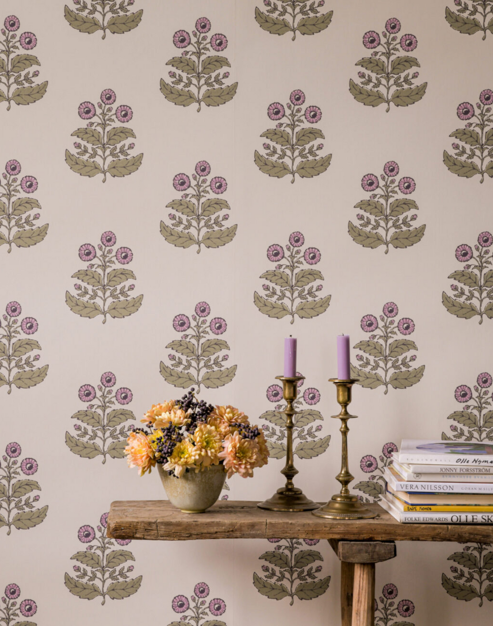 This charming flower print, with inspiration from old woodblock printed fabrics, adds a playful atmosphere to the interior.