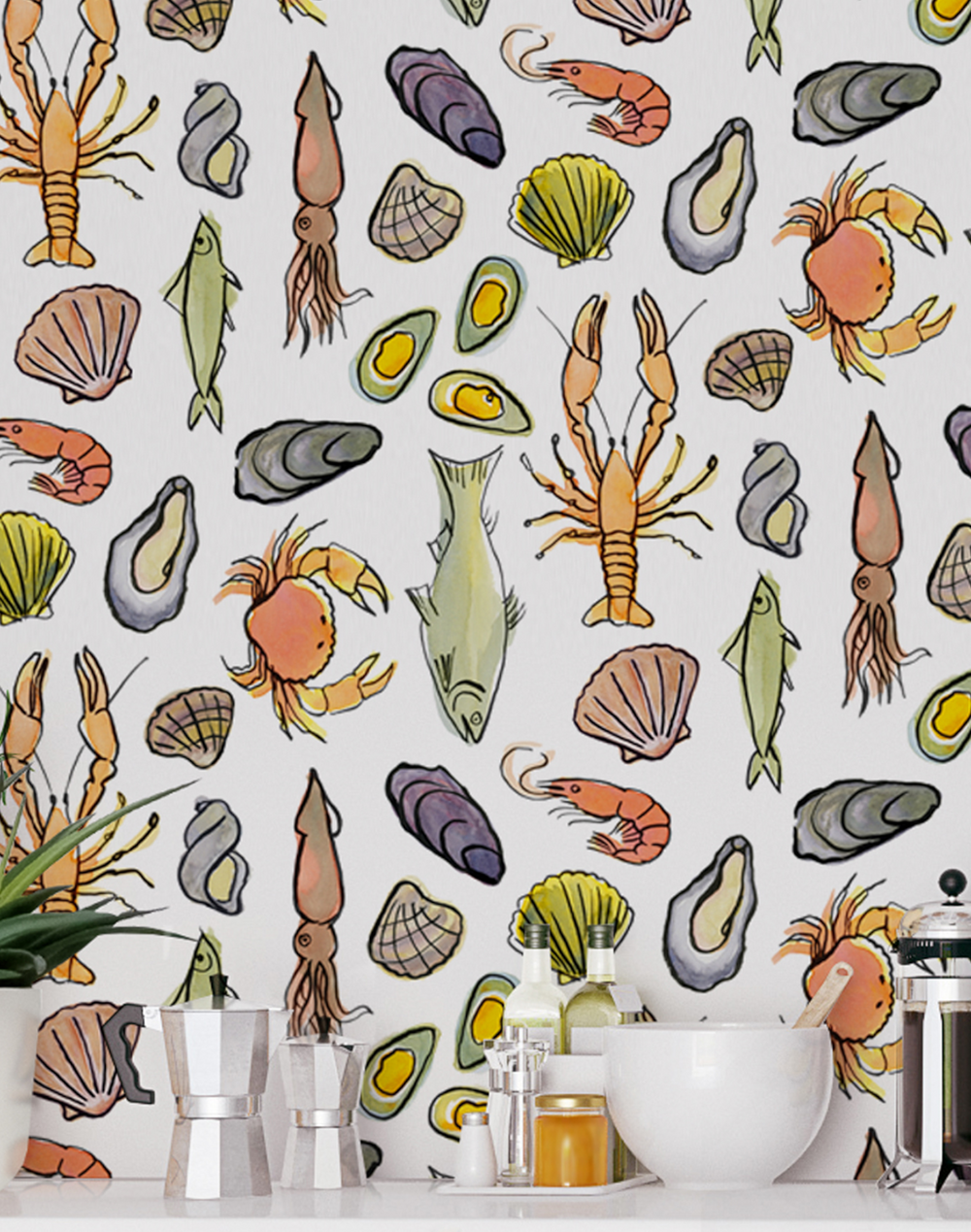A fresh Mediterranean seafood medley. All the ingredients for our favorite holiday pasta dish are celebrated in the exuberant hand painted illustrations of this design.