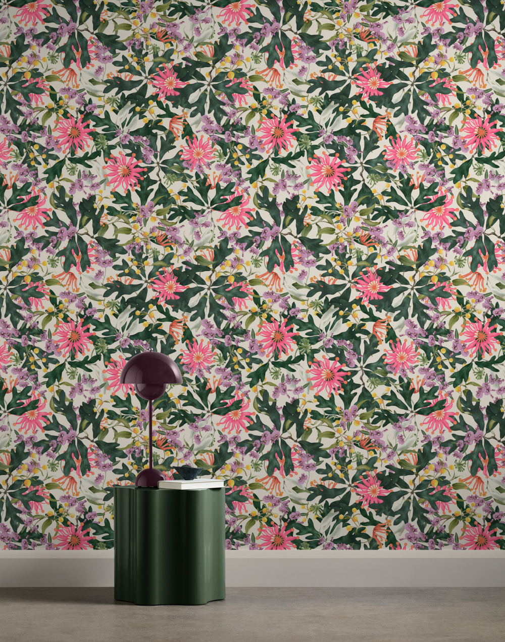 Structured around the beautiful Australian native fire-wheel tree (Stenocarpus sinuatus), Gondwana is a lively display of foliage and flowers. Skillfully hand painted with watercolor, the collection of motifs twist in and out creating depth and movement.