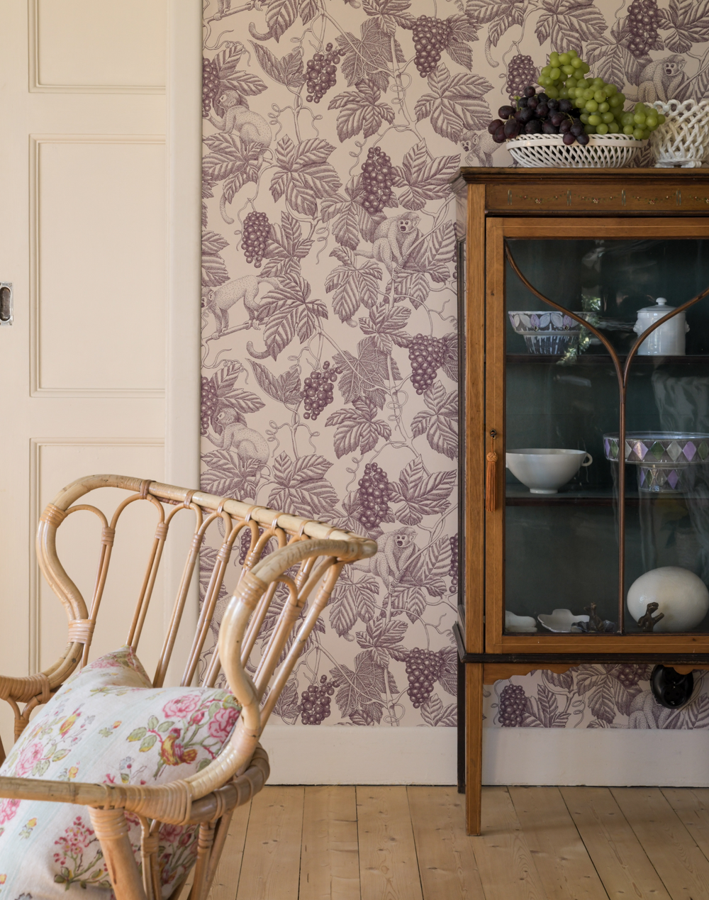 The design Grape Thief, with monkeys stealing grapes from the grapevines, is a playful modern take on traditional Toile de Jouy fabrics. It comes in three colorways.