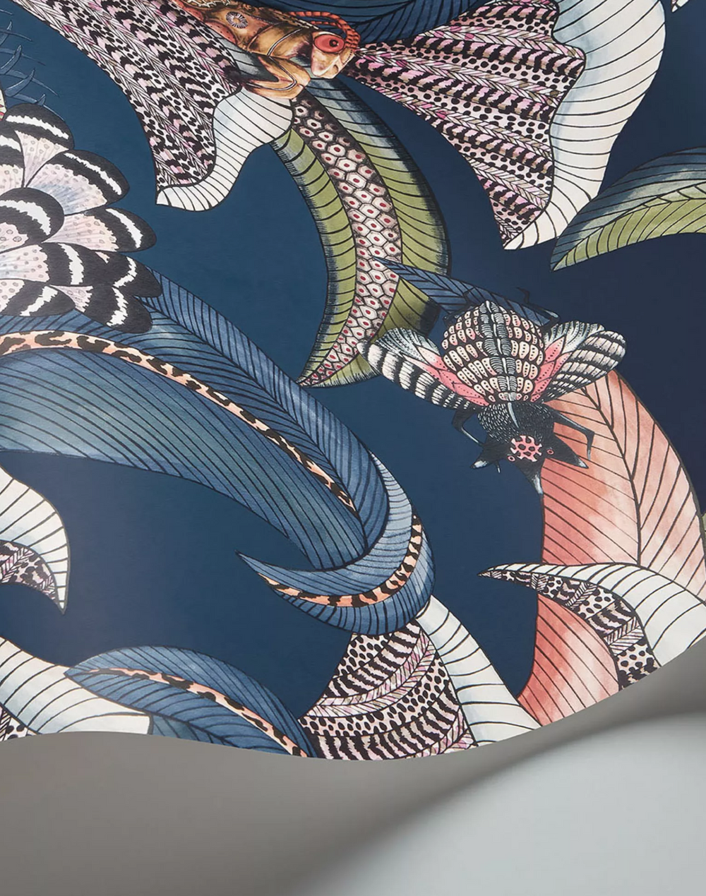 Leaves, fronds and flowers form a lush and peaceful labyrinth within Hoopoe Leaves canopy; a closer glance revealing nature's bustling wonder. What appear to be blossoms are, in fact, the feathery crowns of exotic Hoopoe birds hiding in the foliage alongside wildly embellished beetles and a wide-eyed praying mantis. Every leaf, feather and insect wing is lovingly adorned with intricate patterns evoking Zulu beadwork.