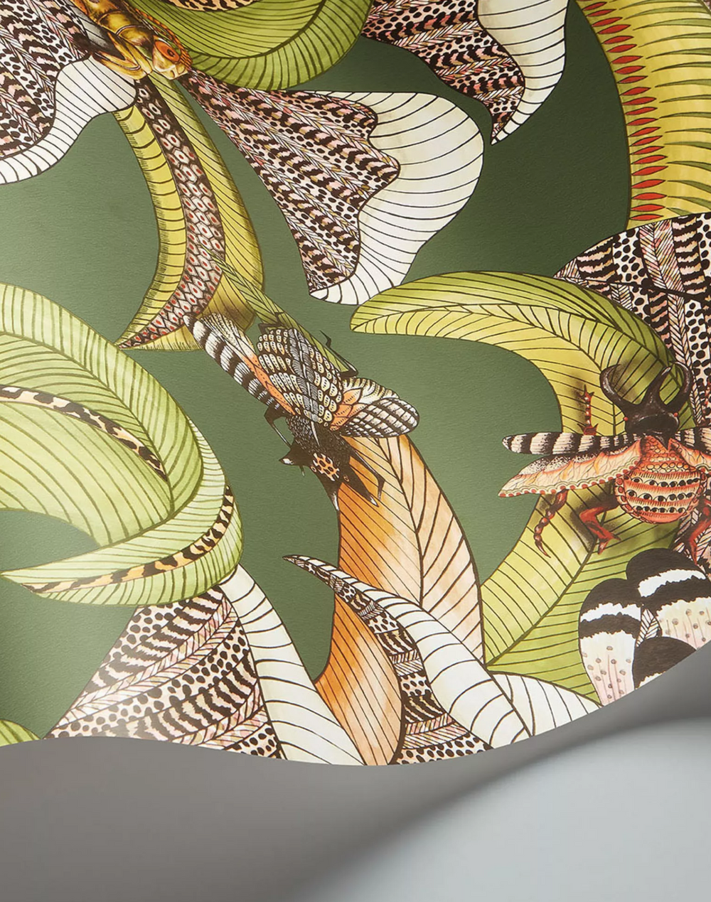 Leaves, fronds and flowers form a lush and peaceful labyrinth within Hoopoe Leaves canopy; a closer glance revealing nature's bustling wonder. What appear to be blossoms are, in fact, the feathery crowns of exotic Hoopoe birds hiding in the foliage alongside wildly embellished beetles and a wide-eyed praying mantis. Every leaf, feather and insect wing is lovingly adorned with intricate patterns evoking Zulu beadwork.