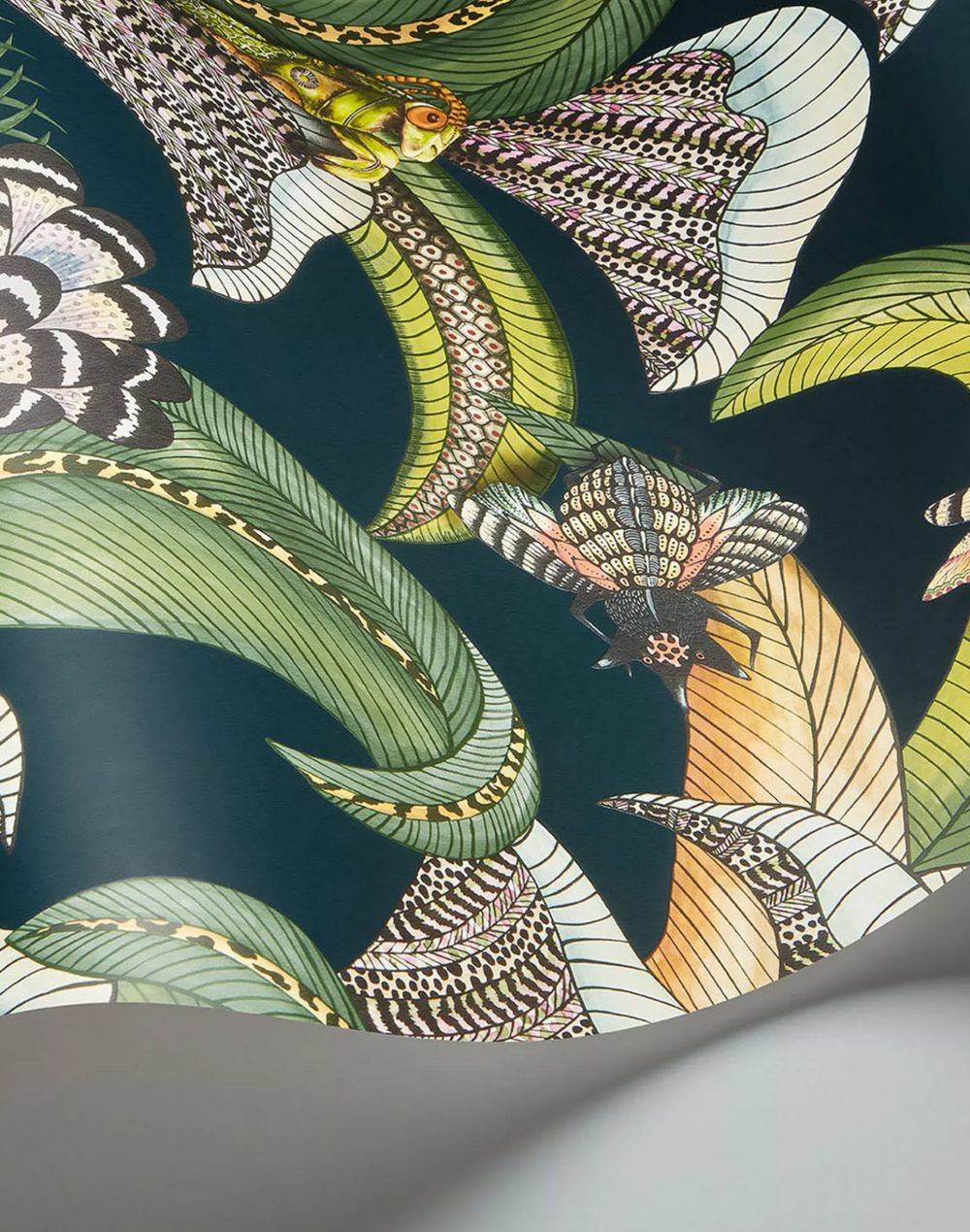 Leaves, fronds and flowers form a lush and peaceful labyrinth within Hoopoe Leaves canopy; a closer glance revealing nature's bustling wonder. What appear to be blossoms are, in fact, the feathery crowns of exotic Hoopoe birds hiding in the foliage alongside wildly embellished beetles and a wide-eyed praying mantis. Every leaf, feather and insect wing is lovingly adorned with intricate patterns evoking Zulu beadwork.