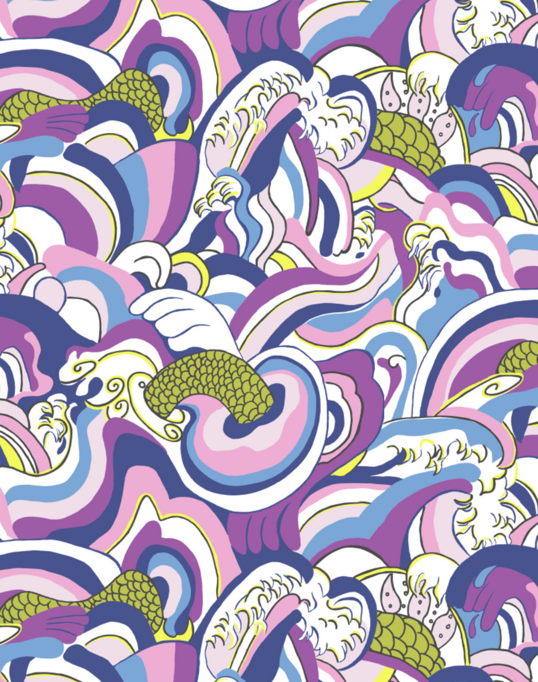 Merenda often draws inspiration from Japanese culture and design. In Ikuchi, it's the fluid waters of Japan and the sea monsters that are believed to dwell beneath, that captivated her to draw and paint this design. The colors and design were also inspired by Santa Cruz skateboards.