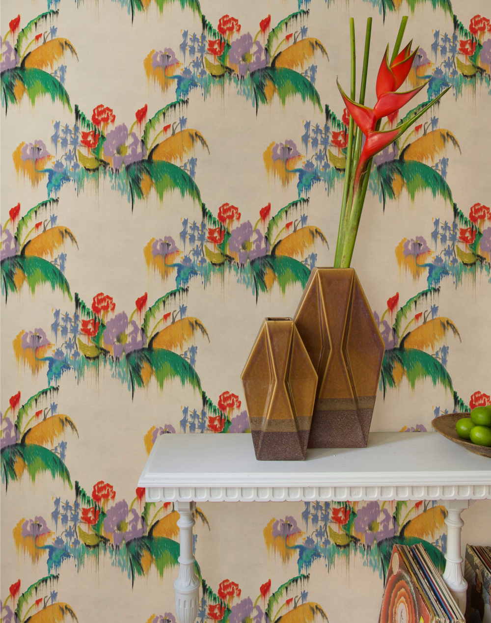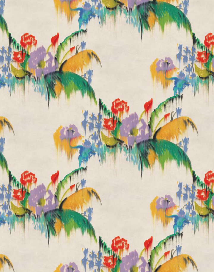 The Isla pattern is a tropical floral posy drawn with soft pastel on a textured stone background. This drawing was made of a stunning mantle arrangement in a Hawaiian Bungalow hotel, the bold, flowing colors bring the warm air and relaxed vacation mood to any room.