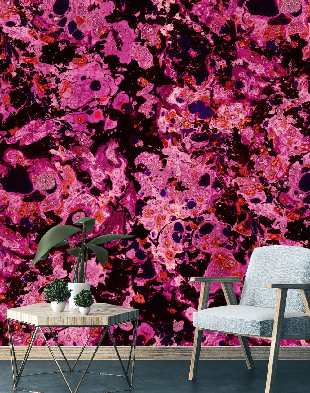 Marbre was created with a paper marbling technique and a lot of experimentation in Merenda’s home in Queens, NY. Its large repeat and scale elevates any space while its rich color options and textures make a dramatic mark.