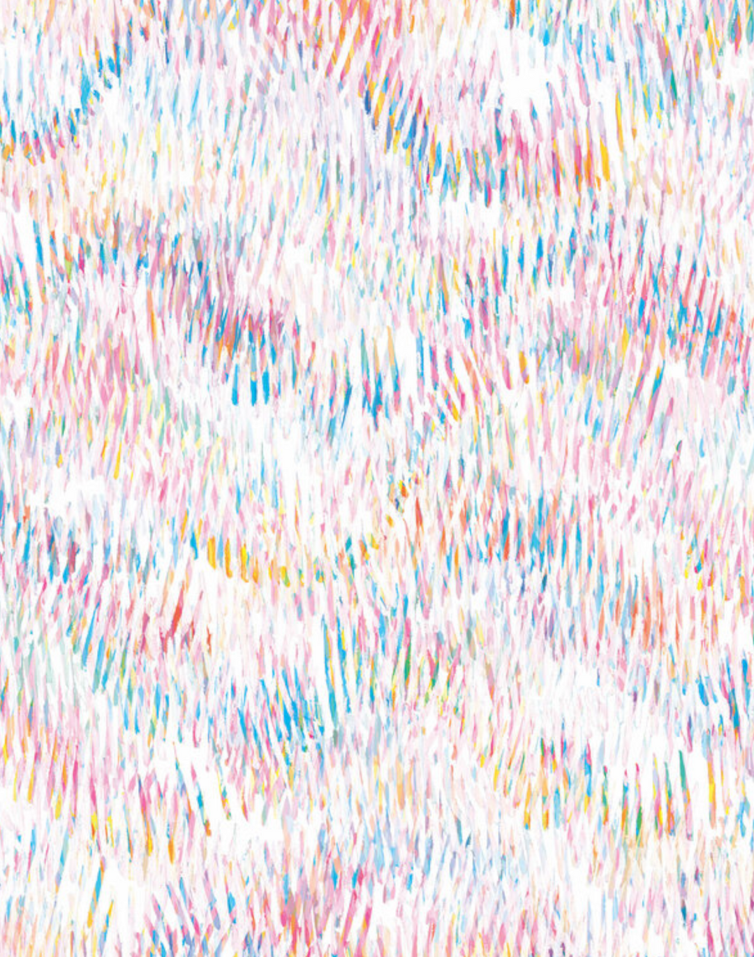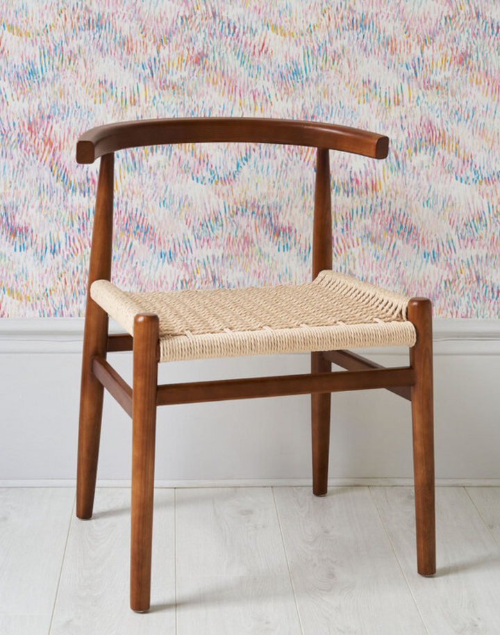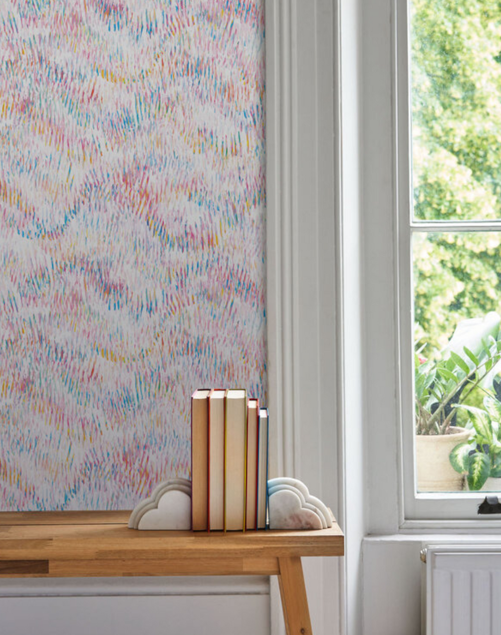 Soft and calming, Meander wallpaper is designed by Rachel Parker and captures all the colors of a gentle walk in an English meadow, when the weather is drifting between sunshine and rain.