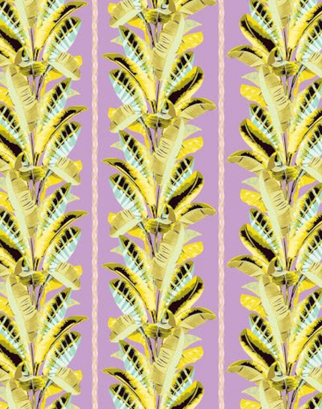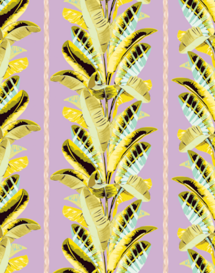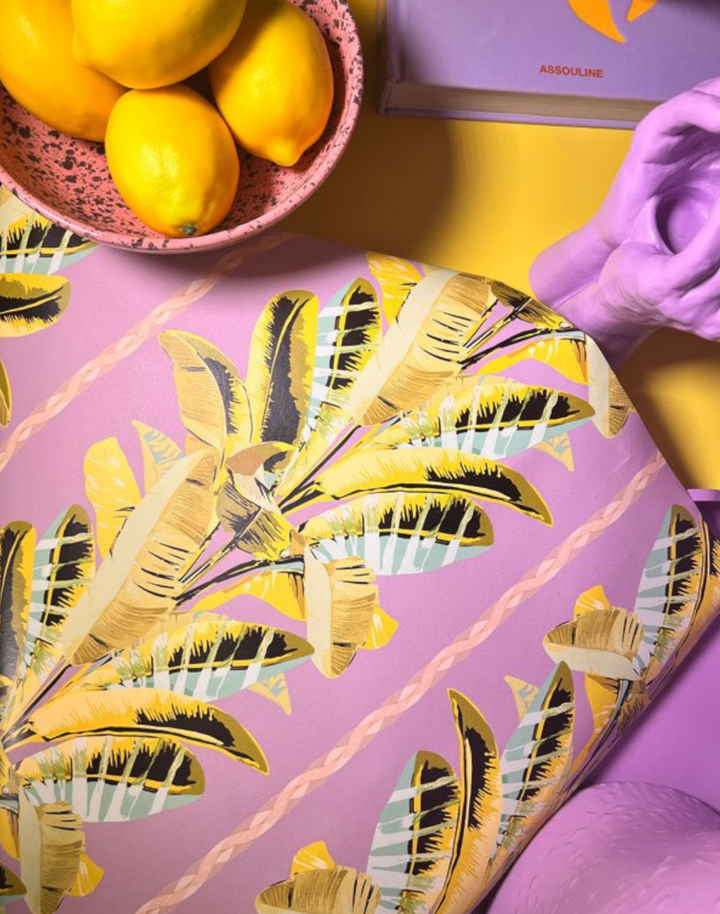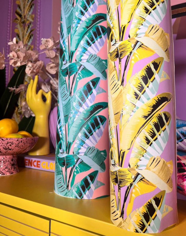Transform your space with this bold and colorful statement wallpaper featuring color palettes inspired by the Art Deco hotels of Ocean Drive in Miami. Hand painted banana leaves with contrasting backgrounds creates a design that adds instant drama to your space. A new take on traditional botanicals that is dramatic, bold and fun!
