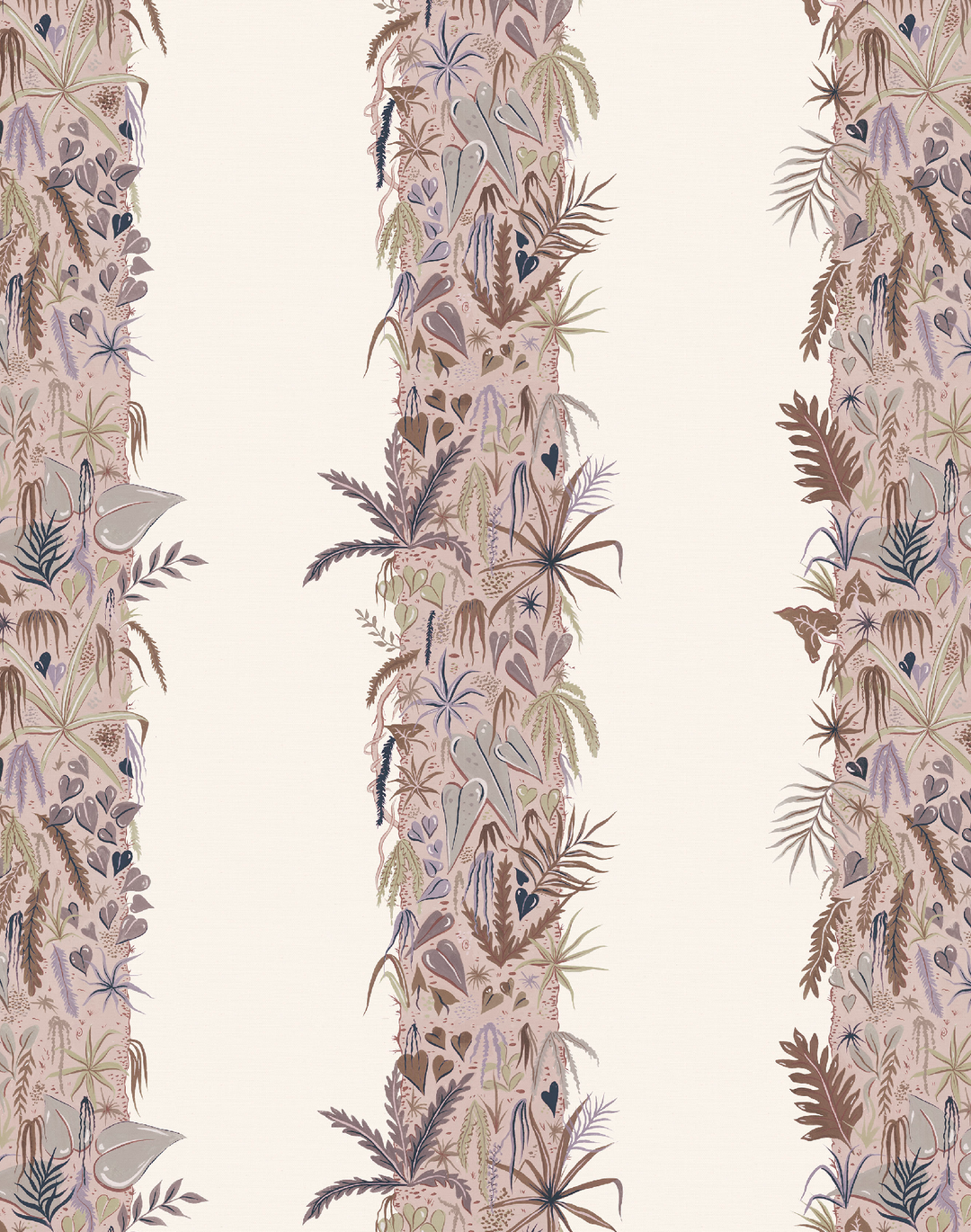 Monte Verde in colorway Morganite-Pink. Monte Verde translated in Spanish means 'green mountain' and inspiration for this print comes from the beautiful Monte Verde Cloud Forest in Costa Rica. A cloud forest occurs within tropical mountainous environments where there is consistent cloud cover and nearly 100% humidity throughout the year. This wet environment allowed for eco systems within eco systems. I was totally fascinated by how each tree trunk was completely inhabited by hundreds of smaller specimens of and that’s was the starting point for the design. Hand Painted in Gauche on Watercolor paper. Morganite is a stunning palette of mineral earthy pinks on an off-white background. The gemstone morganite is said to inspire healing, compassion and promise.
