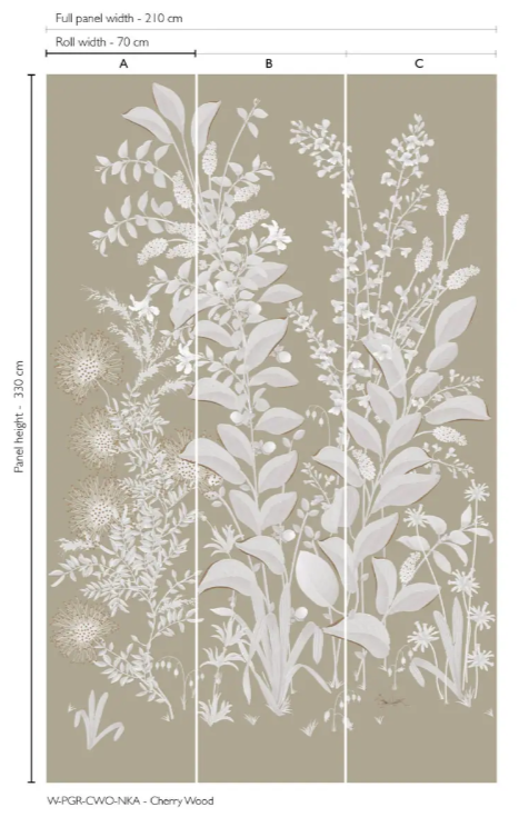 In this exuberant yet purposeful play of color and form, Palm Grand imagines a wild thicket of life on the banks of a river. Intricately drawn waxy leaves, long stemmed grasses and seed pods are punctuated by hand-painted birds, grasshoppers and praying mantises. The contrast of the muted, calming tones of the flora and the electric brightness of the fauna creates a curious interplay of the serene and the captivating. Printed onto panels, Palm Grand has an architectural quality, structuring a space with a sense of order and sophisticated neutrality, whilst also bringing to life a sublime wilderness.