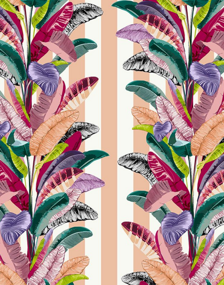 Make a statement and liven up your walls with this bold maximalist wallpaper Inspired by the luxury and decadence of Palm Springs, this stripe wallpaper combined with colorful banana leaves creates bold and colorful wallpaper design that will liven up any space.