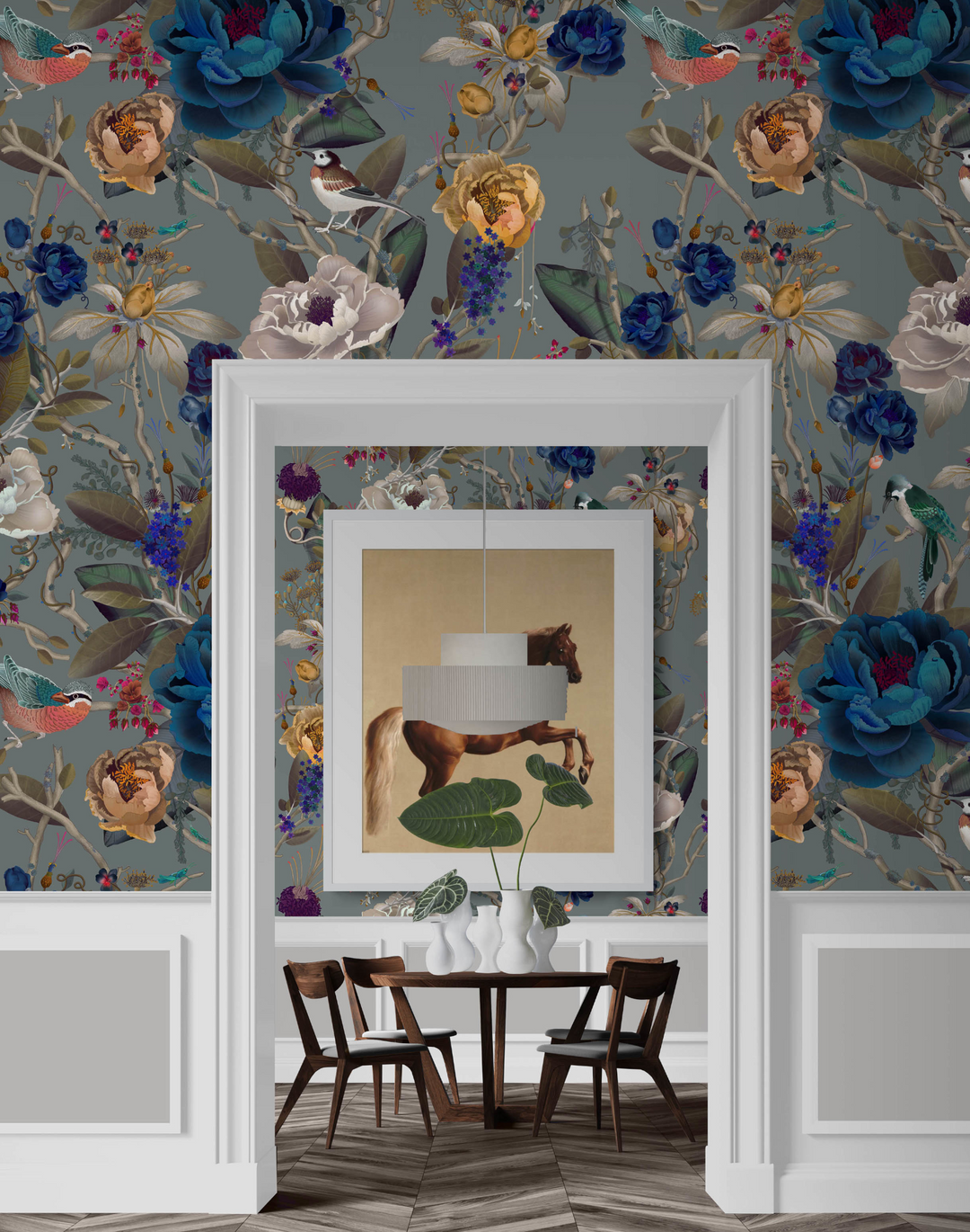 Peony Japonica sees flowers awaken in a magnificent night blooming display. Layer upon layer of brightly colored petals open to reveal jewel-like stamens amidst their regal, delicate crowns. Known as ‘The king of flowers’, these Peonies grow among branches intertwined with tendrils of blue wisteria, coiling lyrically between birds and leaves. Shocks of brilliant oranges, pinks, and blues that leap from muted tones let the finer details of this composition sing up close as well as from a distance. This large-scale wallcovering packs both subtlety and impact.
