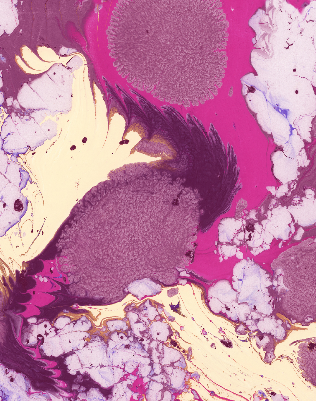 Plunge was created using paper marbling techniques. Merenda put her own spin on traditional techniques through experimentation with spray paint and standard acrylic inks to create this unique pattern.