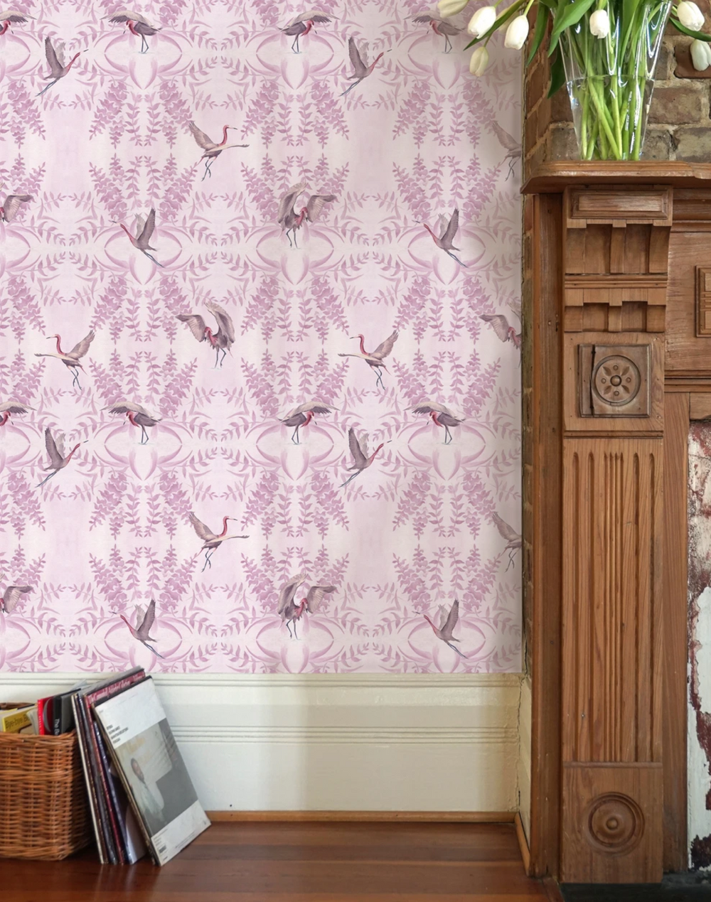 Egrets in various stages of flight are framed by stylized botanicals in lilac tones. The birds’ pale burgundy and soft grey feathers add an earthy touch to this serene wallpaper pattern.