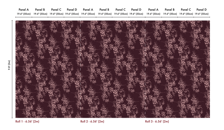 This wallpaper touches on fragments of memories, intertwined with a stylized interpretation of the unruly rambling bougainvillea. ‘Isadore’ is a tale entirely fabricated by the artist, Ronelle Pienaar Jenkin.