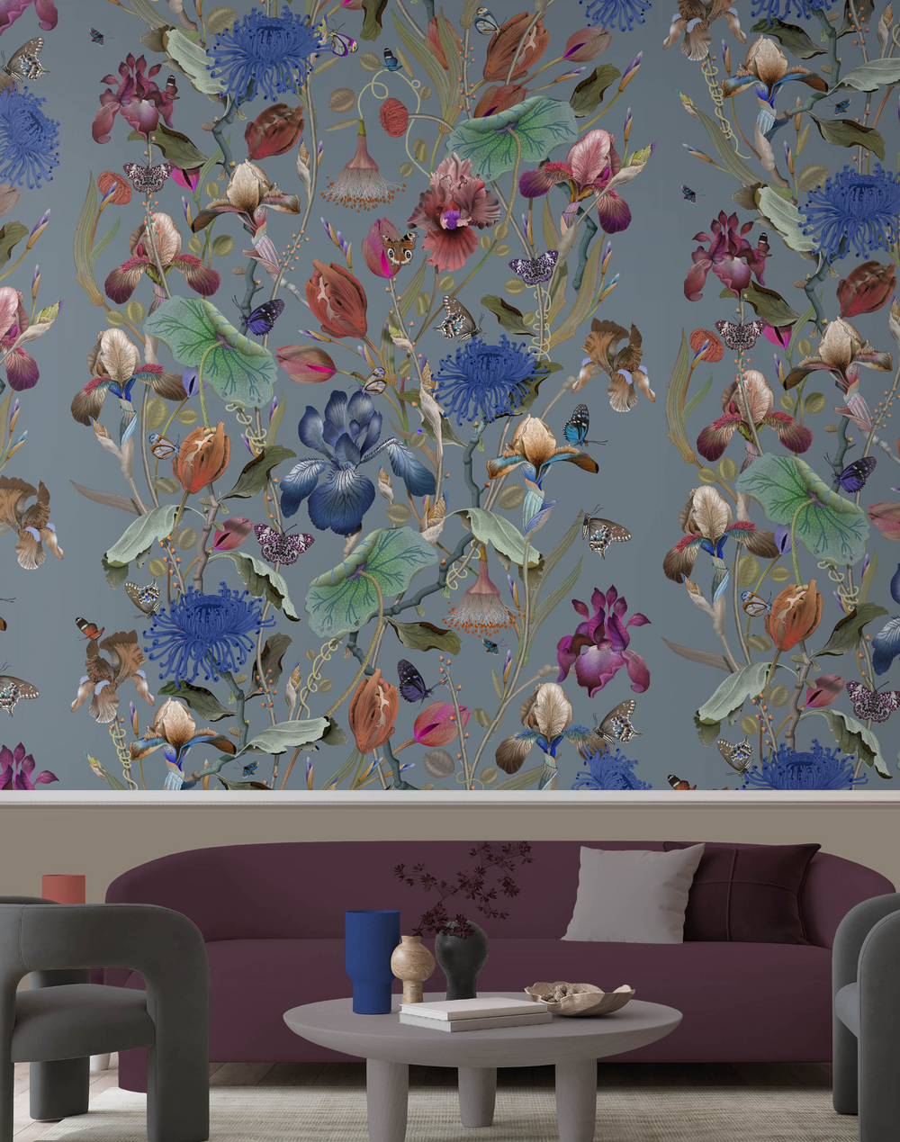 Royal Iris unfurls in a magnificent profusion, glimmering as if one has discovered an untouched plateau composed entirely from the rarest and most precious flowers. Butterflies and rare flora create an almost otherworldly scene. The rich palette of golden ochres, inky blues, and verdant greens imbue this curious realm with depth, luminosity, and opulence. The intricacy and control of the draughtsmanship is given full expression in this magnificent scale, speaking to the distinctive design vocabulary of the studio. The super-wide design has no horizontal repeat which intensifies the dramatic impact of the design whilst also significantly reducing waste.