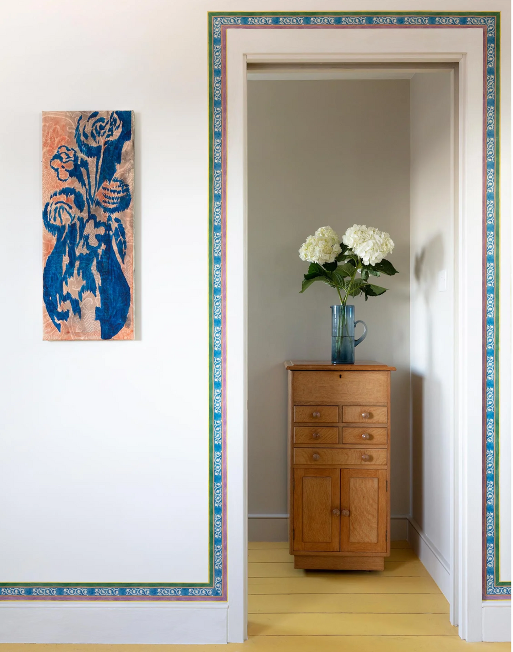 This border is based on a 1918 design by Voysey for a striped woven silk. Silk has its origins in ancient China, where it was kept a precious secret until being smuggled out and revealed to the world as a luxurious commodity. Its opulence is thanks to its unique luster: when it catches the light, natural strands in the material are highlighted. We like to think of wallpaper borders as the highlights you find in paintings, where the lightest areas tend to be added towards the end to give a subject its shape and form. It’s the same with a room: a border has the potential to create real light and shade.