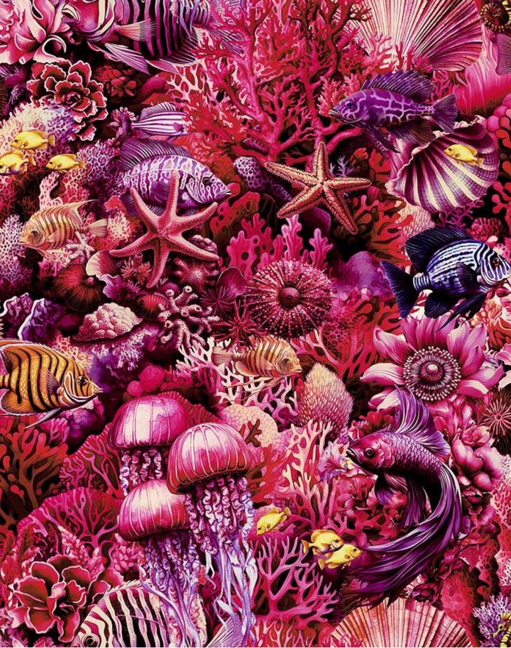This maximalist wallpaper captures the awe-inspiring beauty of the ocean, featuring a vibrant array of coral, tropical fish, shells, and shimmering jewels. The wallpaper itself is full of intricate details and vibrant colors that bring the underwater world to life. Hot, bright pops of color contrast against the darker backdrop. Versatile for both contemporary and traditional settings.