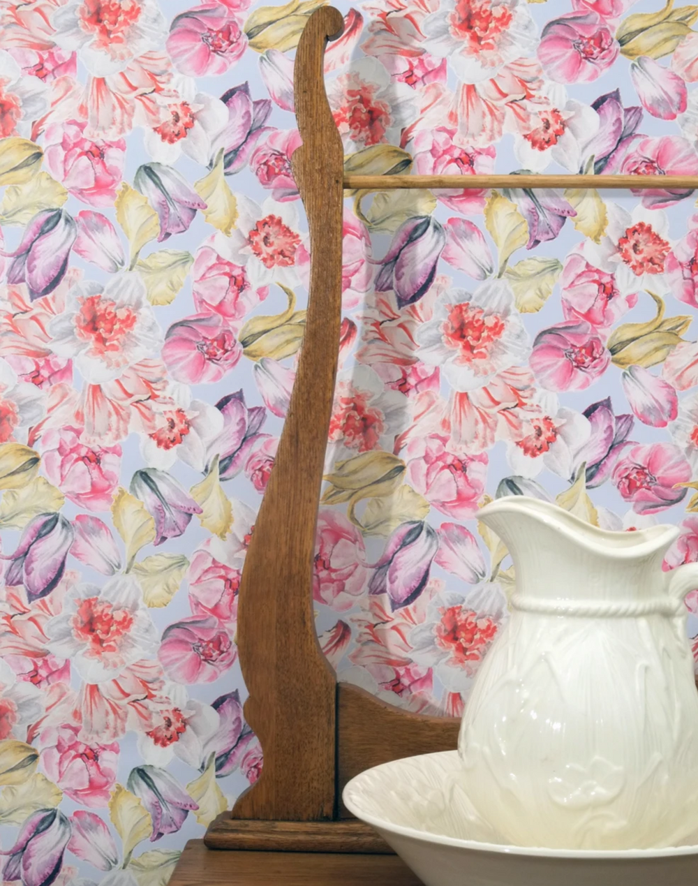 This floral wallpaper pattern is the embodiment of Spring! Tulip and daffodil blossoms and petals in bright pastel pinks, yellows and purples dance against a lavender ground. Perfect for a girls' room, powder room or nursery.