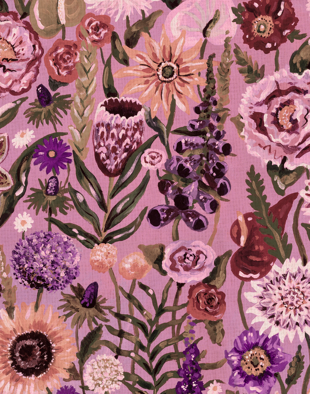 Our stunning print Utopia depicts a painterly meadow of gorgeous vibrant blooms. Titled 'Utopia' it evokes an imagined state in which everything is perfect. Featuring and entanglement of sunflowers, foxgloves, poppies, peonies and orchids ! The Mauve colorway showcases a delightful palette of lilacs, deep reds and emerald greens . Adorn your walls with Utopia Mauve and feel like royalty, historically purple was extremely expensive in antiquity an only the rich and famous could afford it!