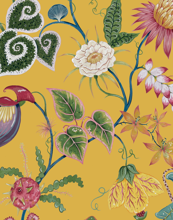 Vida Citrine Wallpaper. Vida is our Costa Rican inspired foliage print. Showcasing the unique bio-diverse flora and foliage this incredible country has to offer. Featuring large scale, weird and wonderful specimens of blooms including banana blossoms, dragon fruits and shampoo flowers. This Citrine Yellow palette brings happiness and warmth in the form of this sunny and cheerful yellow background. Inspired by the semi-precious gemstone citrine which spiritually promotes prosperity, wealth and self-esteem.