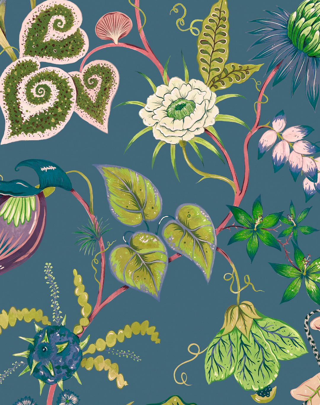 Vida Cobalt-Blue Wallpaper. Vida is our incredible Costa Rican inspired floral print. Showcasing the unique bio-diverse flora and foliage this incredible country has to offer. Featuring large scale, weird and wonderful specimens of blooms including banana blossoms, dragon fruits and shampoo flowers. This unusual yet inviting palette of mid blues and greens is a real showstopper. The cobalt blue background was inspired by the natural pigment, often described as neither cold or warm and thus exudes a cool inviting energy.