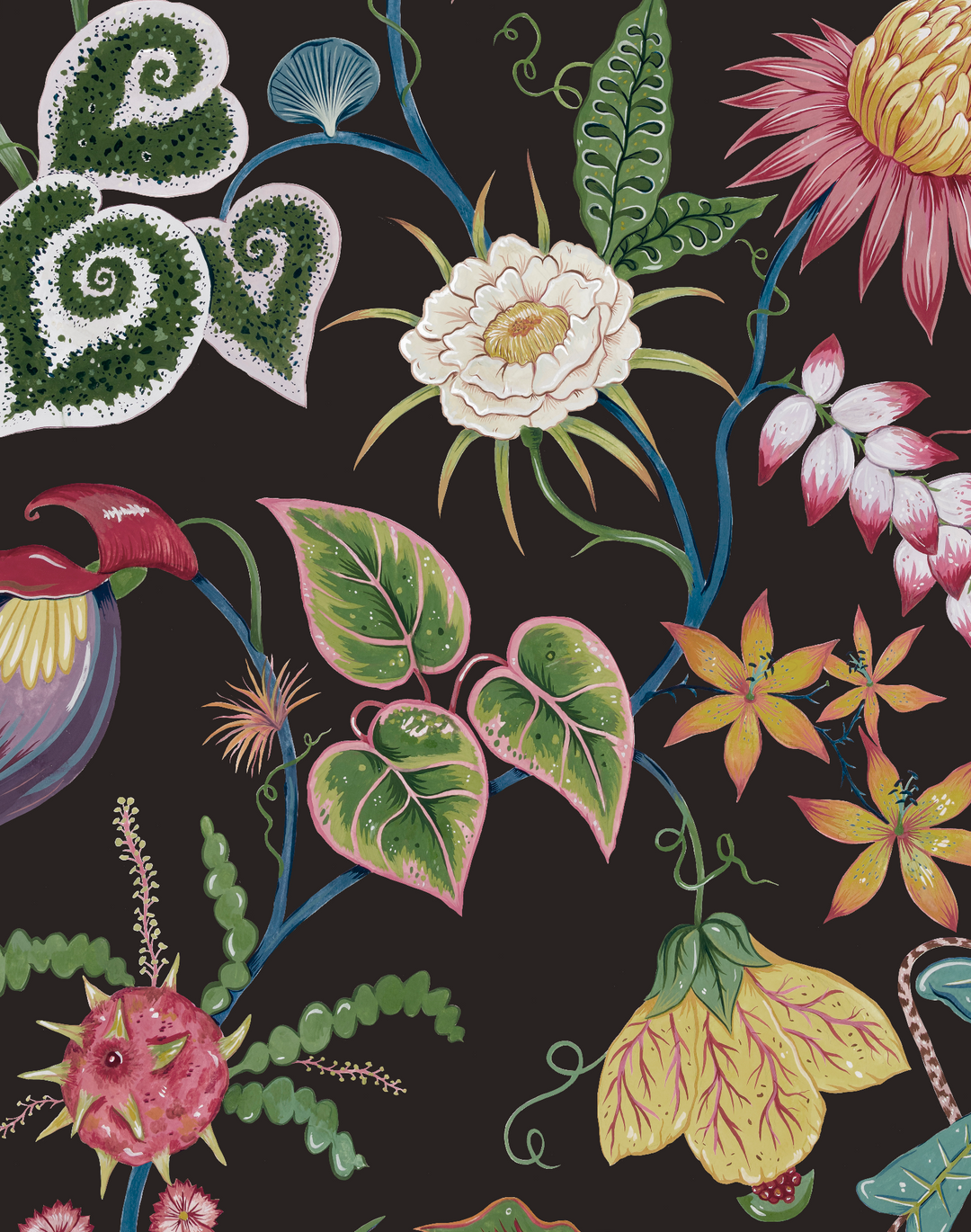 Vida Obsidian Black Wallpaper. Vida is our incredible Costa Rican inspired floral print. Showcasing the unique bio-diverse flora and foliage this incredible country has to offer. Featuring large scale, weird and wonderful specimens of blooms including banana blossoms, dragon fruits and shampoo flowers. This gorgeous Obsidian Black colorway really allows the natural colors of the foreground fauna to sing. This palette inspired by an Obsidian gemstone which spiritually is known to promote protection, fulfilment and manifestation.