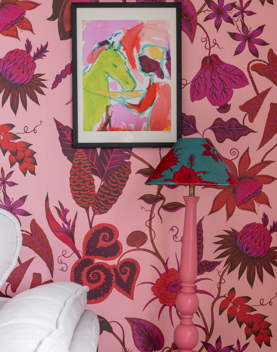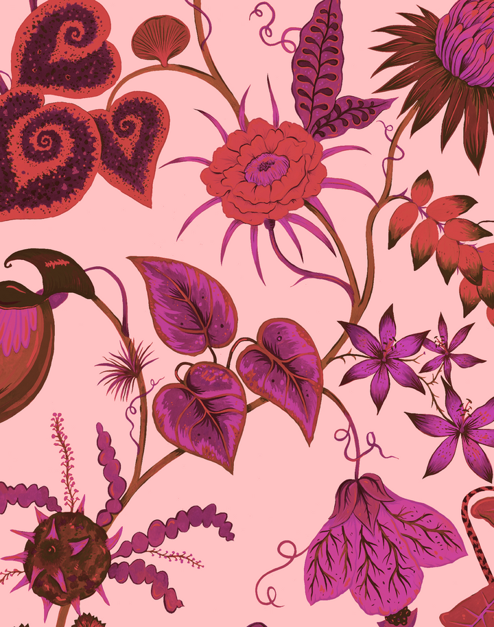 Vida Rhodonite Wallpaper. Vida is our incredible Costa Rican inspired floral print. Showcasing the unique bio-diverse flora and foliage this incredible country has to offer. Featuring large scale, weird and wonderful specimens of blooms including banana blossoms, dragon fruits and shampoo flowers. This Rhodonite-Pink colorway is a bold and lively colorway featuring a stunning mix of vibrant pinks with bold pops of red and fuchsia. Rhodonite Pink is inspired by the natural gemstone that spiritually promotes forgiveness, love and purpose.