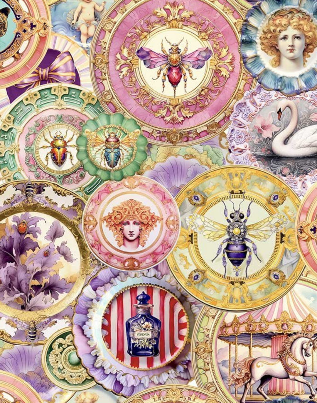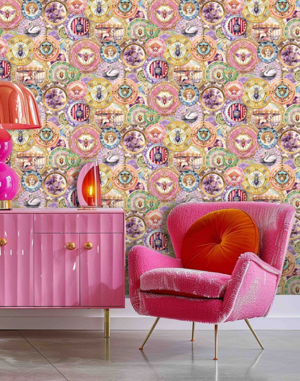 This maximalist wallpaper features whimsical pastel plates featuring delicate swans, carousel horses, graceful hummingbirds, dainty bows, and bejeweled ladybirds. Transform your space into a maximalist heaven and set the scene for a super fun interior!