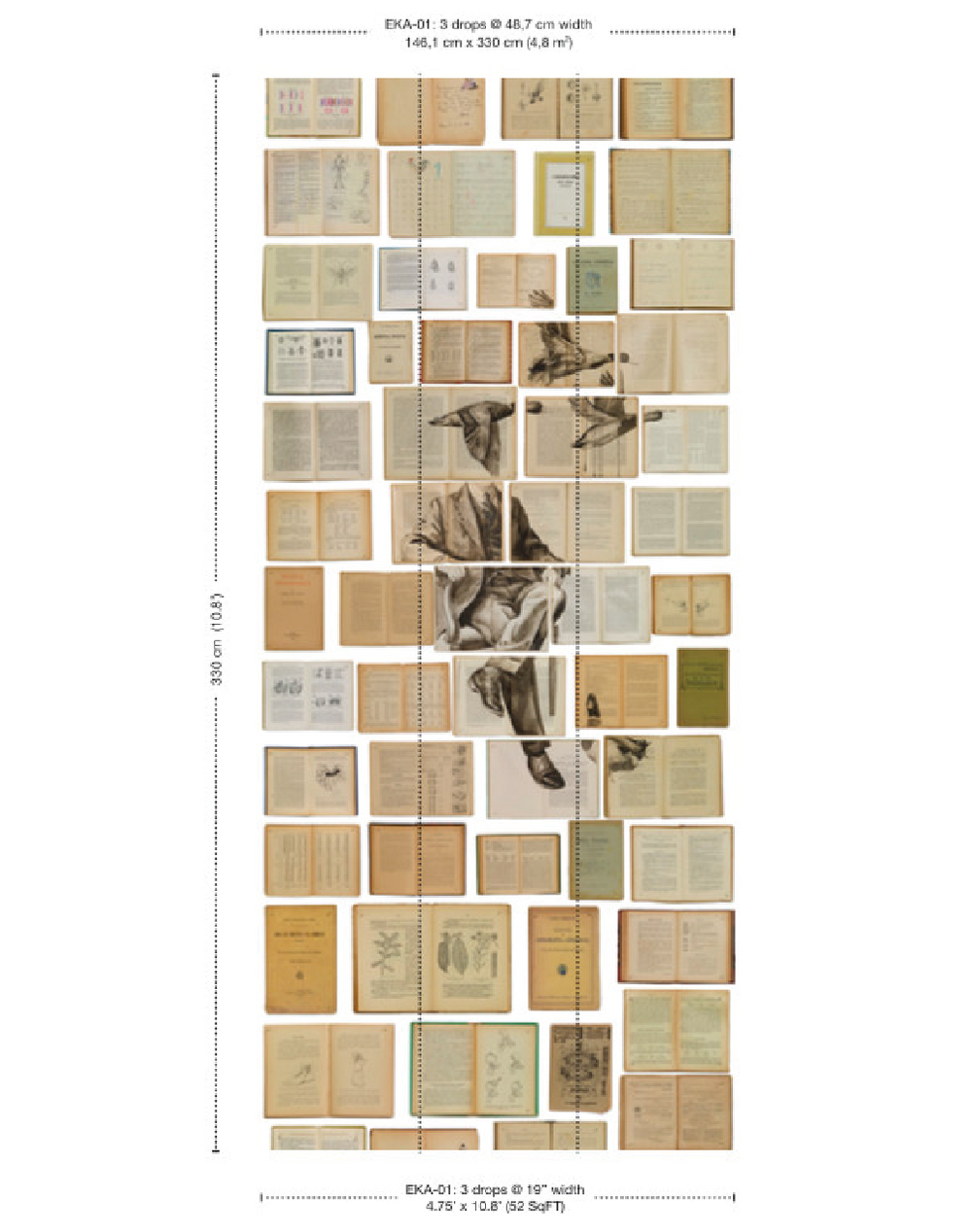 The middle of this wallpaper is a mural of 3 drops. This is installed in the middle of the wall. On the sides you can add a roll that only contains books. EKA-07 is the white variant with books only, EKA-08 comprises black books. The mural is 3 drops, the rolls are 2 drops (see below for sizes).