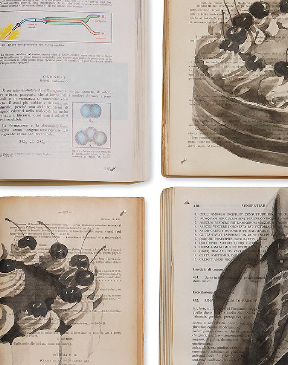 This collection comprises old books on which large paintings have been painted, ultimately resulting in 7 designs (5 murals and 2 wallpaper rolls).