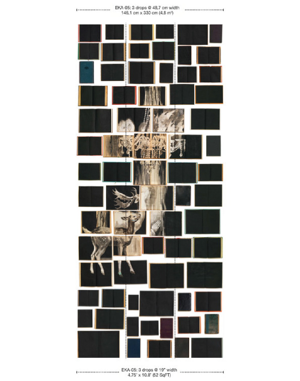 The middle of this wallpaper is a mural of 3 drops. This is installed in the middle of the wall. On the sides you can add a roll that only contains books. EKA-07 is the white variant with books only, EKA-08 comprises black books. The mural is 3 drops, the rolls are 2 drops (see below for sizes).