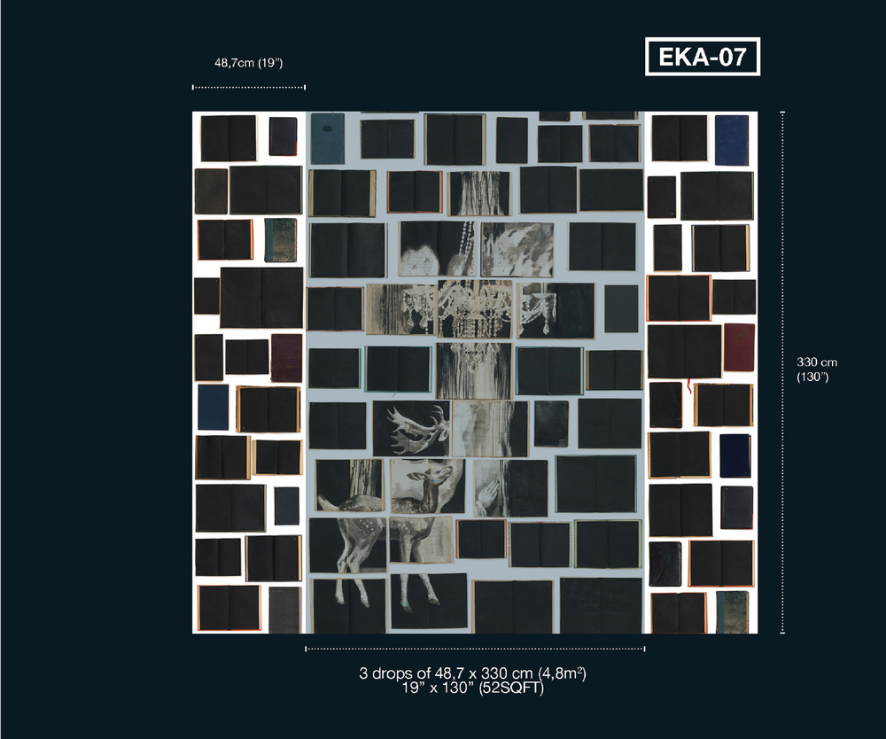 The middle of this wallpaper is a mural of 3 drops. This is installed in the middle of the wall. On the sides you can add a roll that only contains books. EKA-07 is the white variant with books only, EKA-08 comprises black books. The mural is 3 drops, the rolls are 2 drops (see below for sizes).