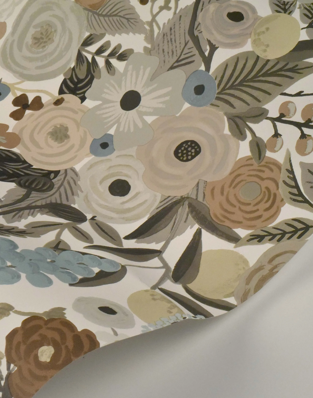 Our classic floral, Garden Party, is an array of bold bouquets and fruit. The scale makes a statement in both bright and neutral colorway options. This wallpaper is gravure printed and comes in 27 inch rolls with a 24 inch repeat.