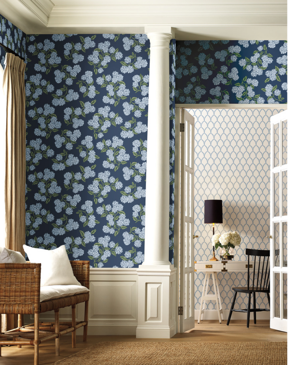 Clusters of hydrangeas are an elegant and timeless way to bring a garden into your space. This wallpaper is screen printed and comes in 27 inch rolls with a 25.25 inch repeat.