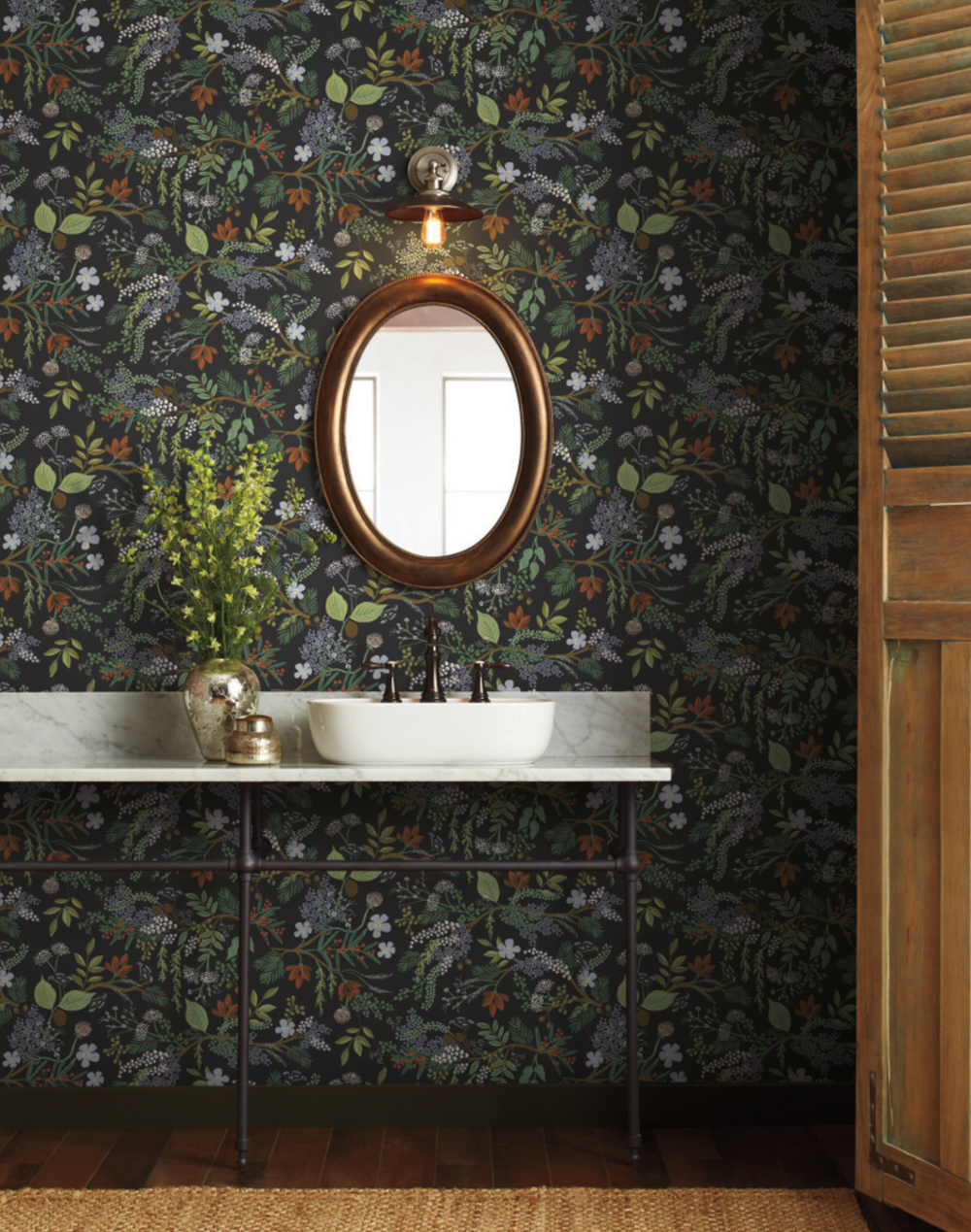 Bring the outdoors in with Juniper Forest, a layered, woodsy design, featuring clusters of berries, hanging moss, and pinecones tucked into rambling stems and branches. This wallpaper is gravure printed and comes in 27 inch rolls with a 24 inch repeat.