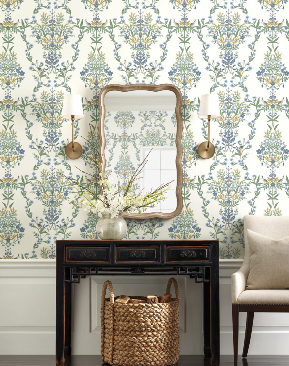 Drawing inspiration from French palace gardens, Luxembourg features mirrored medallions of florals, greenery, and the occasional bird to create a pattern that is sophisticated and timeless. This wallpaper is gravure printed and comes in 27 inch rolls with a 24 inch repeat.